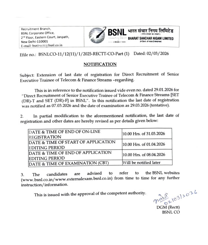 CategoryBSNL Senior Executive Trainee Recruitment 2026