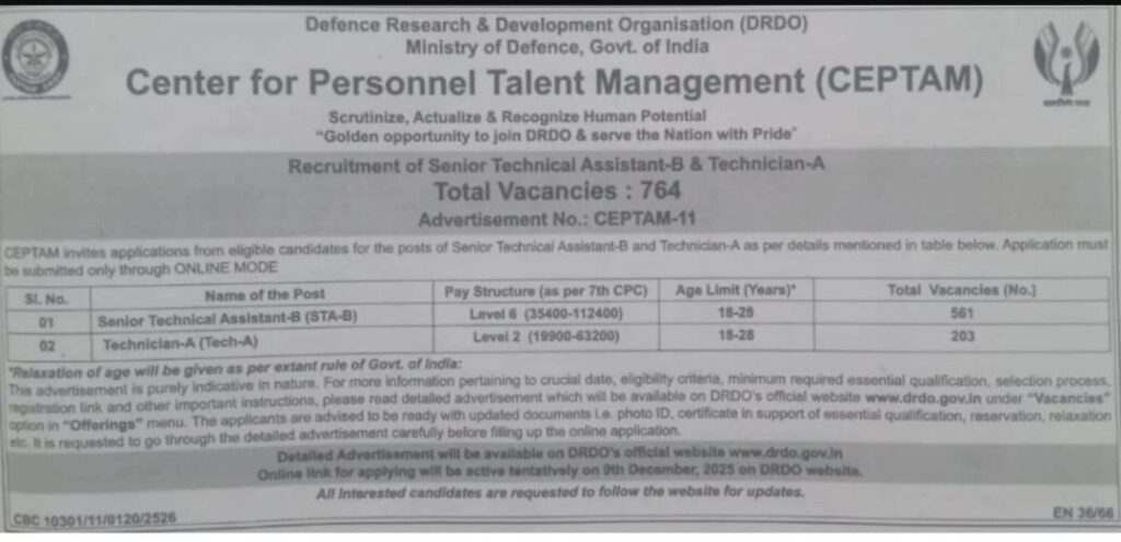 DRDO CEPTAM-11 Recruitment 2025: The Defence Research and Development Organisation has released the latest Notification for the recruitment of Senior Technical Assistant-B, Technician-A Posts. The total number of vacancies for DRDO CEPTAM-11 Recruitment 2025 is 764. The DRDO CEPTAM-11 Recruitment 2025 Notification has been released in 06-12 December 2025 Employment Newspaper and Online Application will be accepted from 09 December 2025 to 08 January 2026.