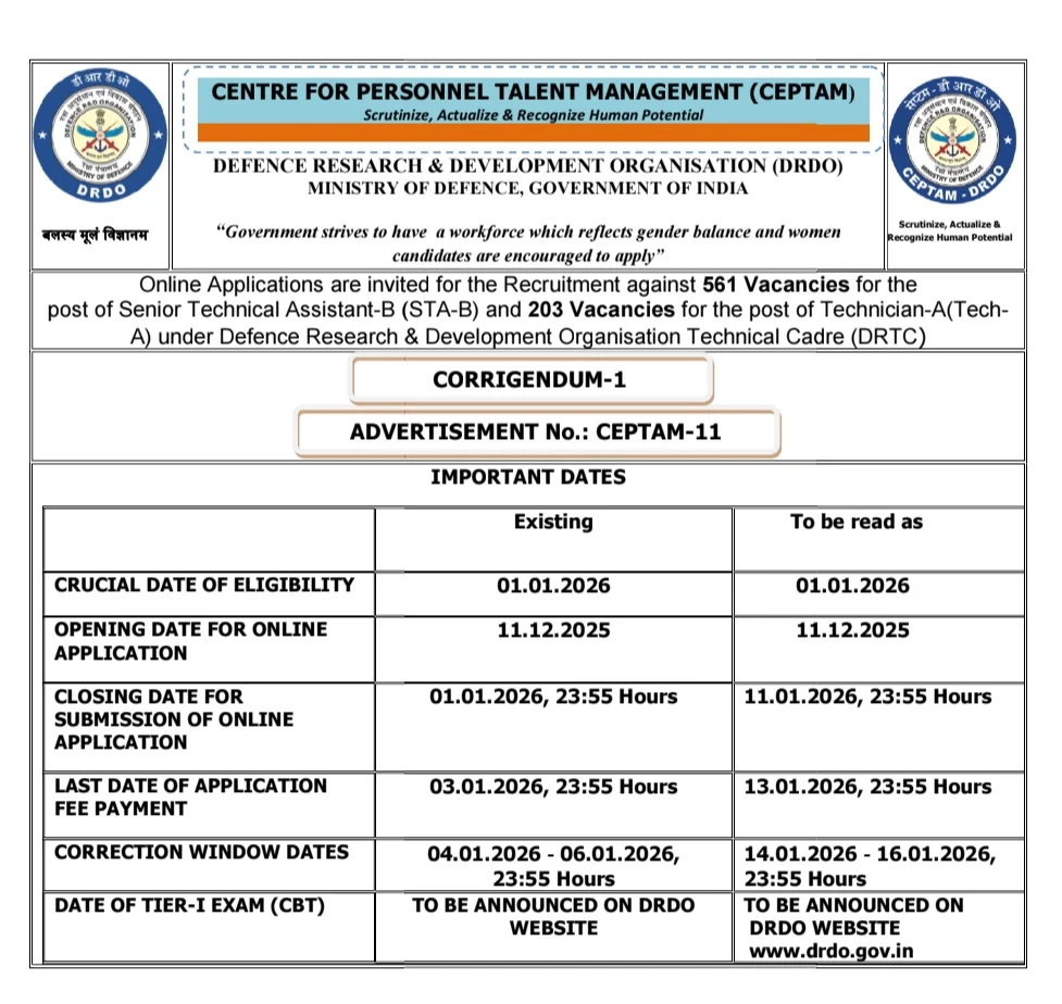 DRDO CEPTAM-11 Recruitment 2025Important Dates