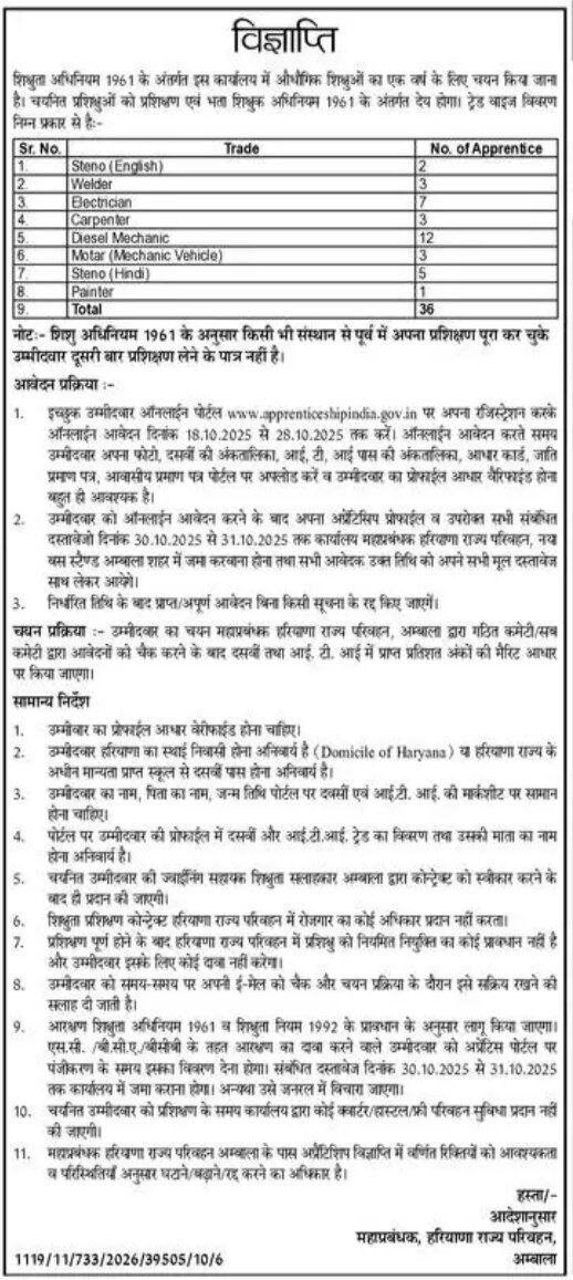 Haryana Roadways Ambala Recruitment 2025: The Haryana State Transport Department, Ambala Depot has released an official notification for the engagement of Apprentices under the Apprentices Act, 1961 for the training year 2025–26. A total of 36 Apprentice vacancies are available in different trades including Stenographer (Hindi/English), Welder, Electrician, Carpenter, Diesel Mechanic, Motor Mechanic Vehicle, and Painter.