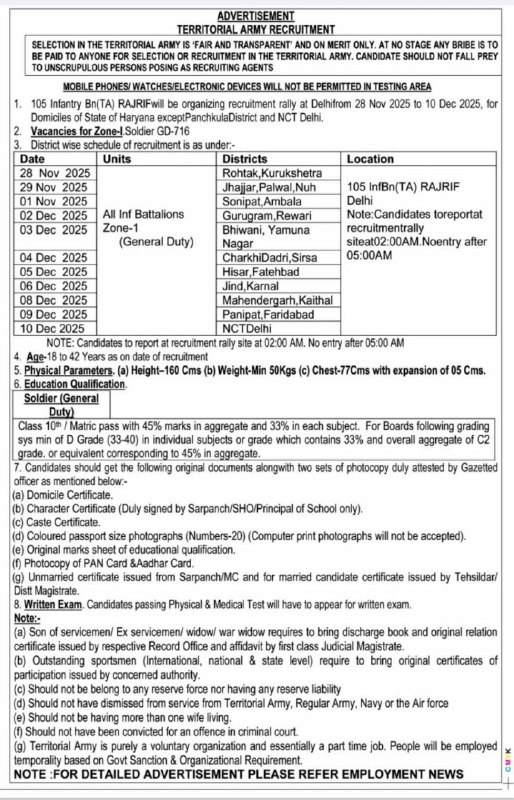 Territorial Army Recruitment 2025 Vacancies & Qualification