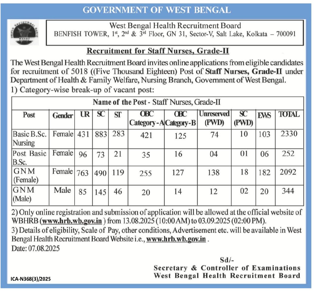 WBHRB Staff Nurse Recruitment 2025: The West Bengal Health Recruitment Board (WBHRB) has officially announced the recruitment of 5018 Staff Nurses, Grade-II in the Department of Health & Family Welfare, Government of West Bengal. Eligible candidates are invited to apply online for various posts including Basic B.Sc. Nursing, Post Basic B.Sc. Nursing, and GNM (Female & Male).